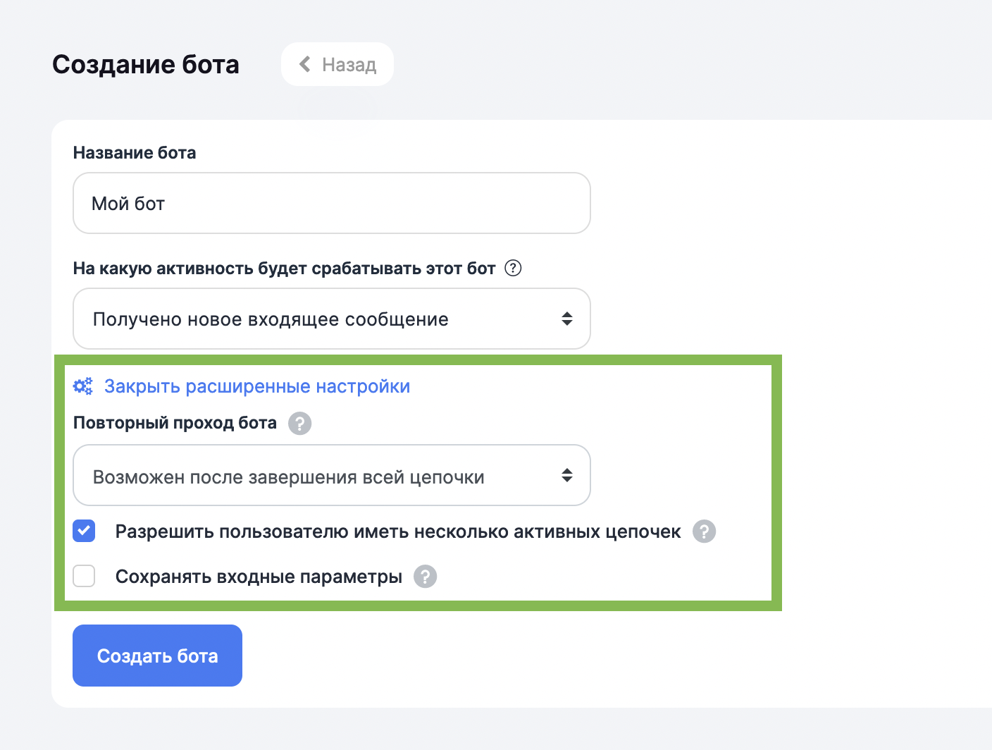 Для составления более сложных ботов или при создании нескольких ботов всегда проверяйте расширенные настройки бота. Они находятся в выпадающем меню на странице настроек бота.