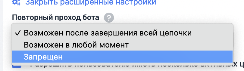 1. **Возможен после заверешения цепочки** - пункт по умолчанию. Он означает, что если пользователь прямо сейчас проходит шаги в этом боте, то он не сможет начать его заново. Но при этом, когда он завершит прохождение бота (пройдет блок, от которого нет никаких связей далее), он сможет начать бота заново